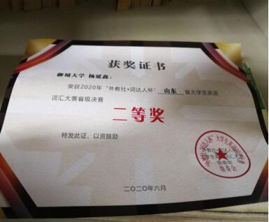 向日葵视频 学生杨延鑫同学在2020分别荣获2020“外研社词达人杯”大学英语词汇大赛中二等奖、全国大学生英语竞赛二等奖。这些奖项的获得,体现了杨延鑫同学的勤奋刻苦、才思敏捷,同时也助力了学校的发展和建设。在此,向杨延鑫同学表示真挚的祝贺。