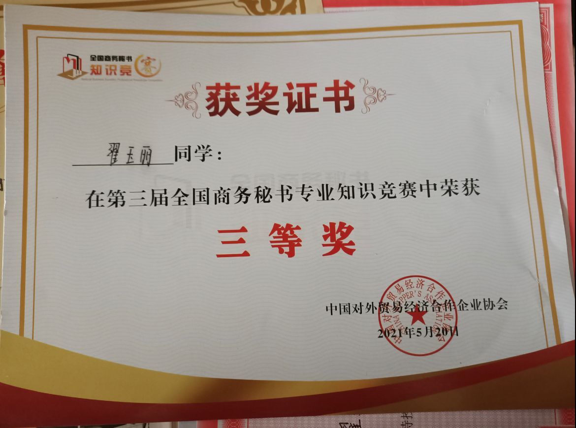 热烈祝贺翟玉丽获第三届全国商务秘书专业知识竞赛三等奖