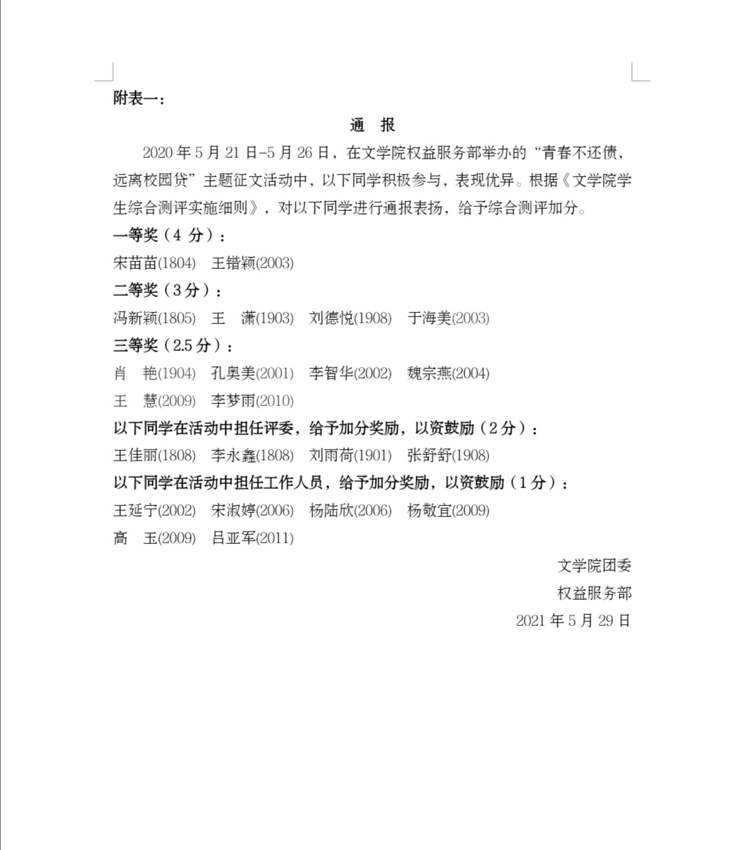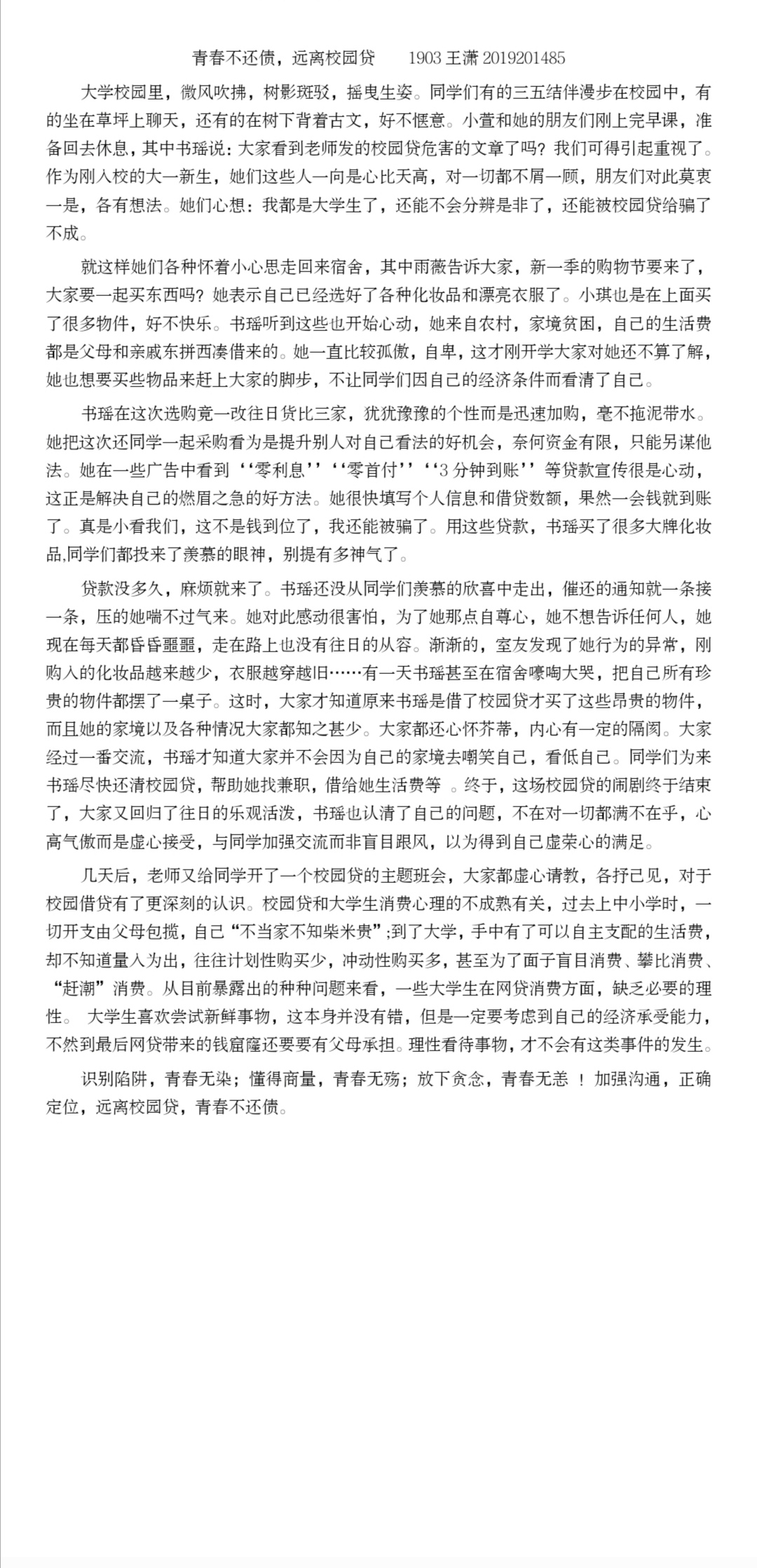 为推动学生深入了解校园贷的危害,提高辨别能力,远离各类校园贷诈骗行为,5月20日至26日,向日葵视频 权益服务部于线上举办“青春不还债,远离校园贷”主题征文活动。向日葵视频 部分同学积极参与。