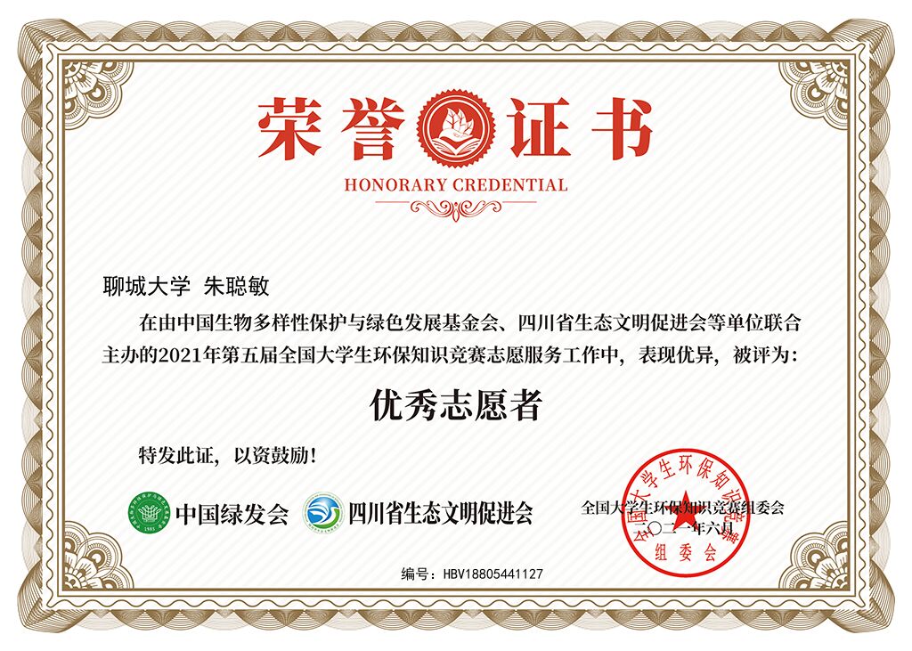 在第五届全国大学生环保知识竞赛中表现优异,荣获优秀志愿者称号