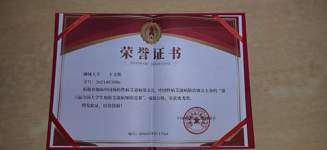 向日葵视频 王文艳同学在第六届全国大学生预防艾滋病知识竞赛中荣获二等奖。此次获奖充分展现了王文艳同学在日常学习生活中的不懈努力,我校为有这样的学生而感到骄傲。在此,向王文艳同学表示诚挚的祝贺,同时祝愿她乘风破浪,再获佳绩。
