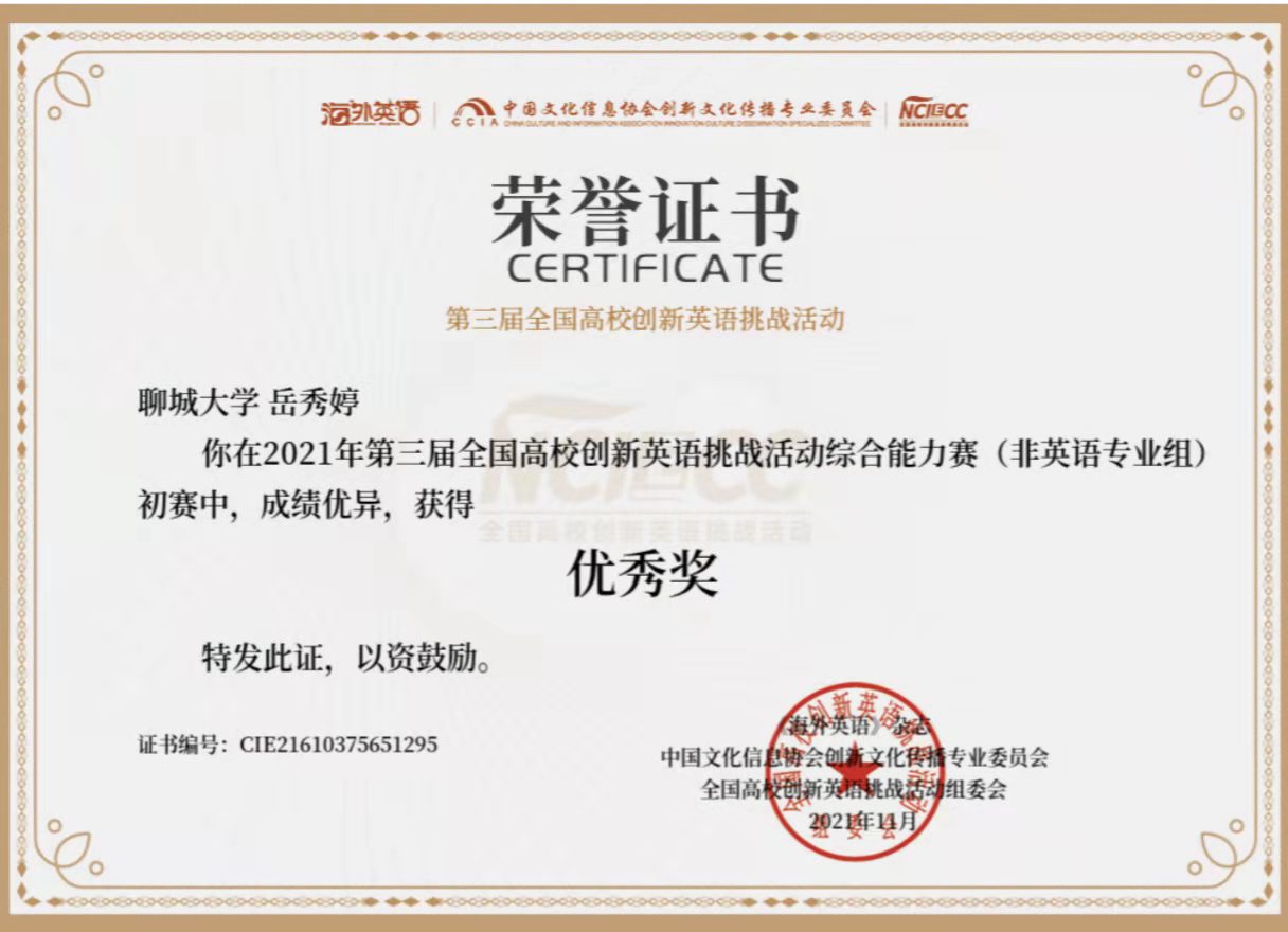 » 热烈祝贺向日葵视频 岳秀婷在全国高校创新英语挑战活动综合赛初赛比赛中荣获优秀奖奖项