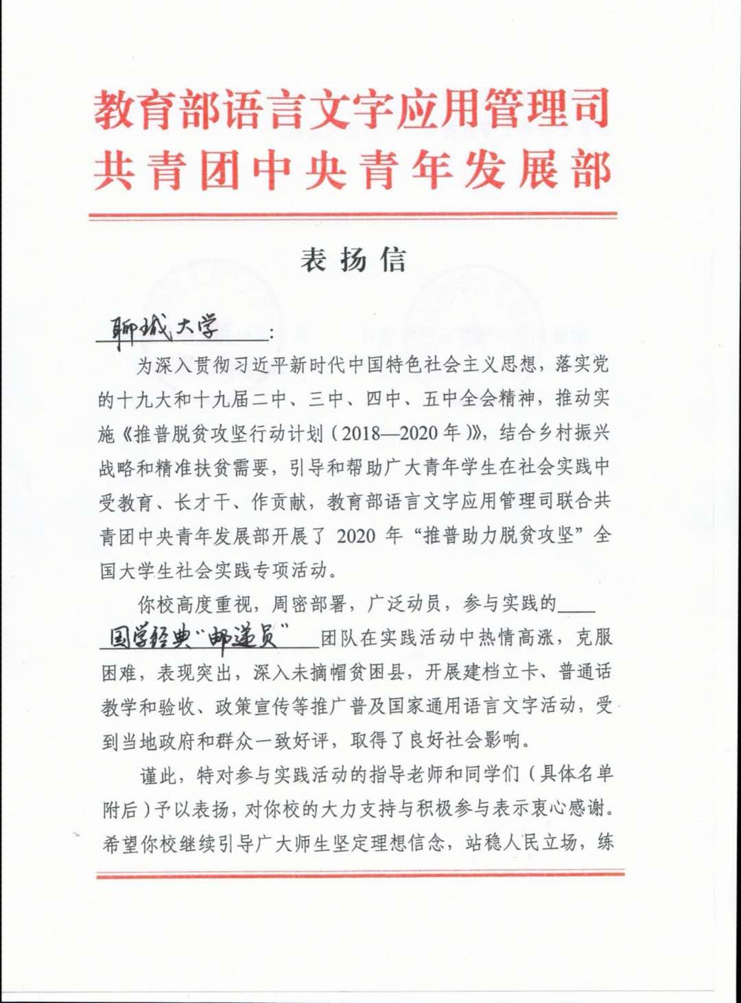 信函中提到:“你校高度重视,周密部署,广泛动员,参与实践的国学经典‘邮递员’团队在实践活动中热情高涨,克服困难,表现突出,深入未摘帽贫困县,开展建档立卡、普通话教学和验收、政策宣传等推广普及国家通用语言文字活动,受到当地政府和群众一致好评,取得了良好社会影响。谨此特对参与实践活动的指导老师和同学们予以表扬,对你校的大力支持与积极参与表示衷心感谢。”