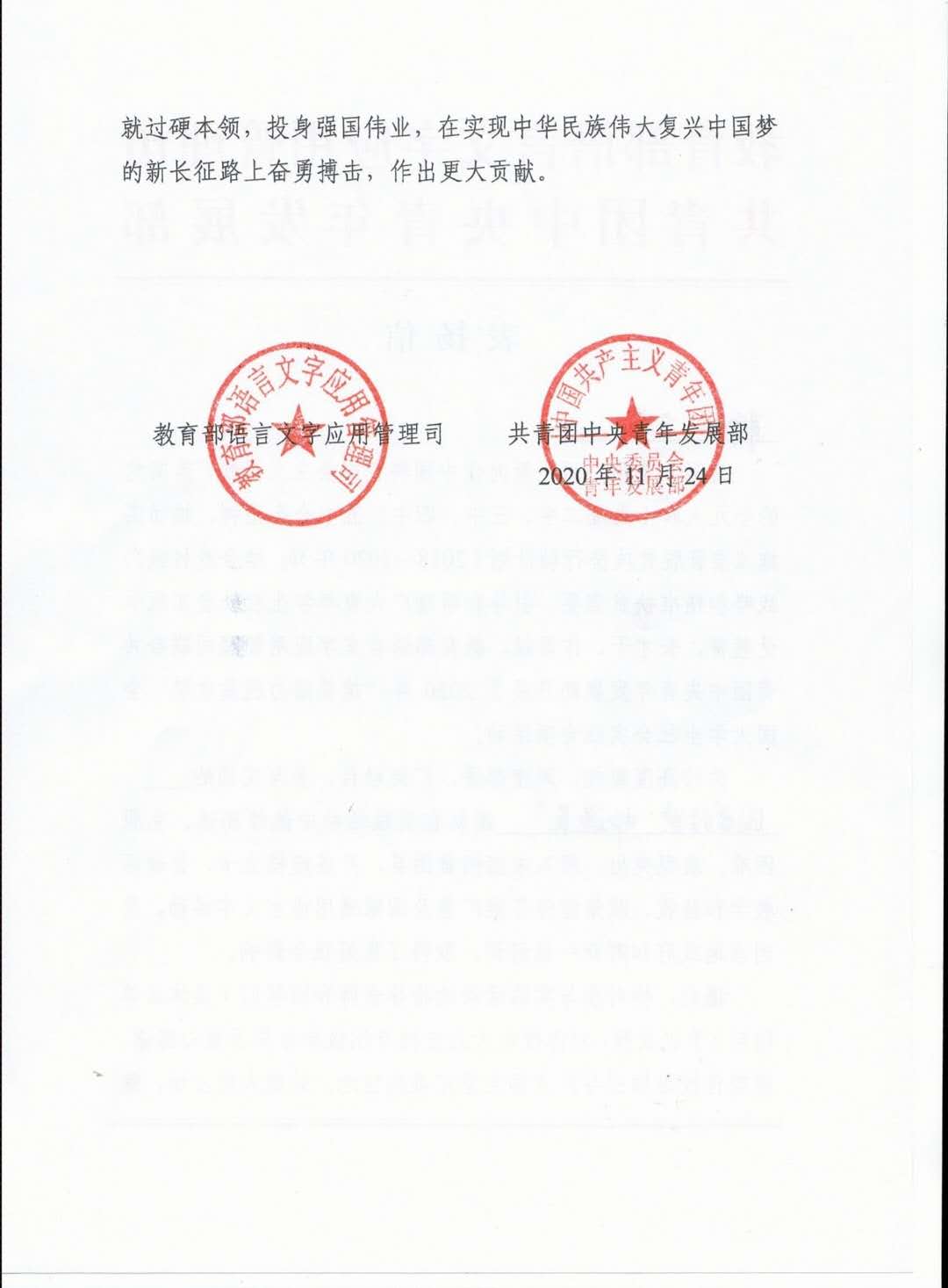12月21日,向日葵视频 国学经典“邮递员”团队收到了来自教育部语言文字应用管理司、共青团中央青年发展部的表扬信。该信特别感谢团队对2020年“推普助力脱贫攻坚”大学生暑期社会实践活动的大力支持和积极配合,并对团队在实践中取得的优异成绩提出表扬。