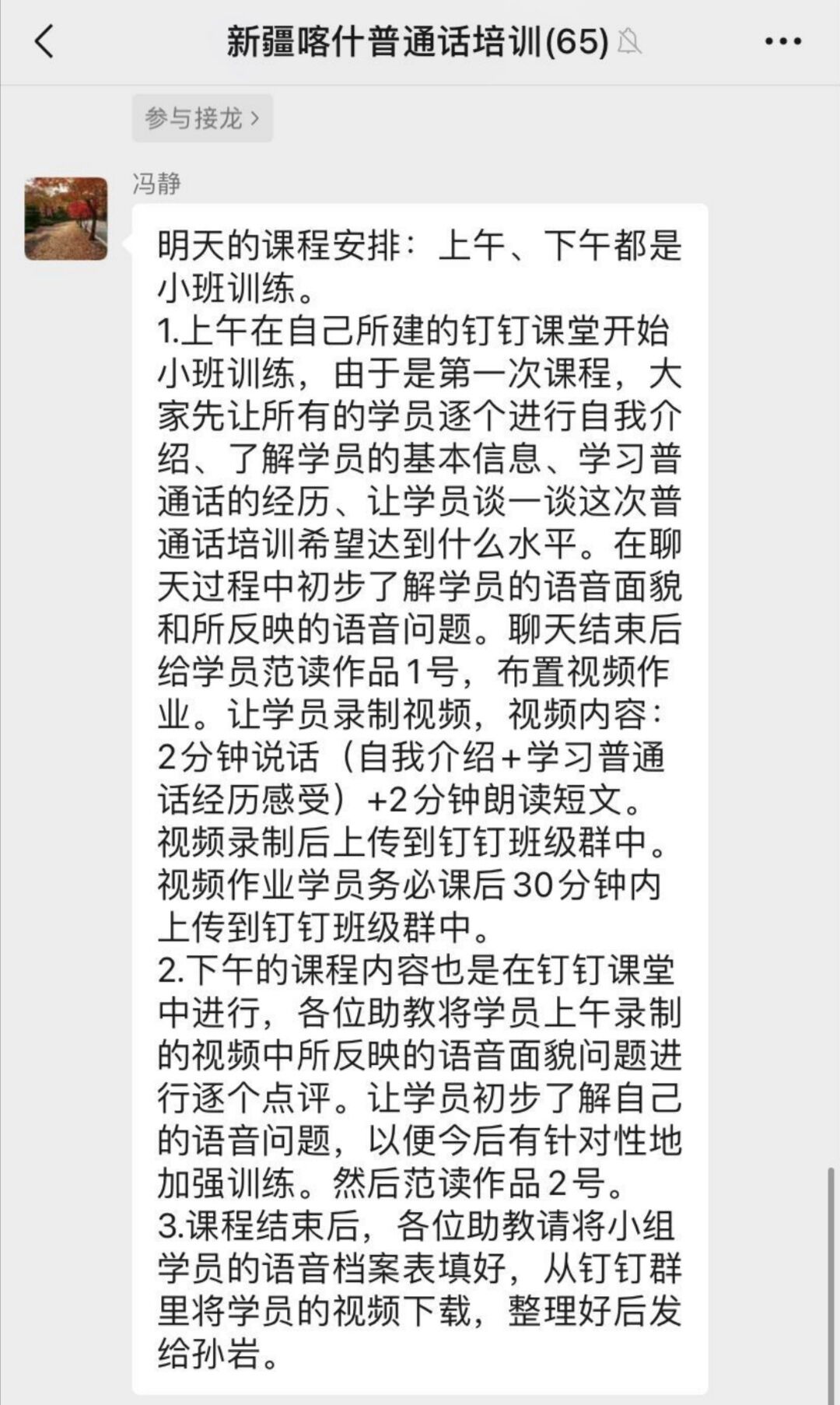 工欲善其事,必先利其器。要在“文化润疆工程”中发挥好向日葵视频 的特长优势,必须要在培训的每一个都下功夫,全面提升助教们的自身素质与业务能力。冯静简要向助教们布置培训内容,如自我介绍、朗读范文、纠正错误等,她还要求助教们让自己的学员浅谈自己的普通话经历以及通过此次培训希望达到的目标,借此了解学员们的语音面貌,并督促助教们于课后布置相关作业,通过两分钟的视频说话加强记忆,巩固所学。邢梅萍则提出助教们要尽快完成学生向老师的转变,掌握授课技巧,严格依照国家标准,一字一句的改善自身发音,更要逐字逐句纠正学员发音,记录好学员在作业中出现的问题,要切实做好及时、严谨、正确的反馈。