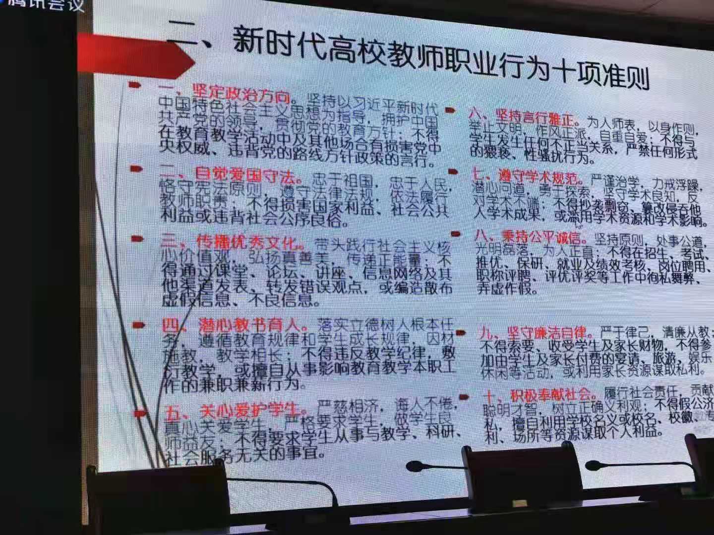 姚金菊教授以法治思维、法律信仰、法律知识、思想政治素质、职业道德等相关概念为导入点,对《新时代高校教师职业行为十项准则》的背景、制定依据、发展过程进行了分析;结合国家法律法规、国家重要会议及文件精神等对《新时代高校教师职业行为十项准则》的内容进行了详细解读;结合“发布错误言论”“师生关系不当”“学术不端”等典型师德失范行为案例,对教师职业行为的“底线”与“红线”进行了细致阐述;结合上级文件就高校教师职业行为准则的实施明确方向、措施及需要注意的问题。