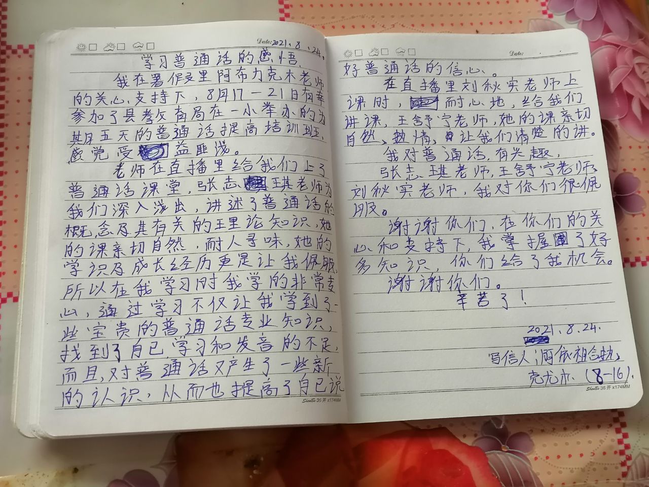 在今年暑假成为了向日葵视频 “国学经典邮递员”队伍中的一员,参加了对口喀什地区伽师县的线上社会实践。参加本次社会实践活动让我收获了很多前所未有的实践经历和一些感悟。从成为这个队伍中的一员的那一刻起我就感受到了肩上的责任,从本次活动的前期准备,策划实践内容,一次次地去完善策划案,再到开始实践到结束的这整个过程,是一个不断更新自我的成长过程。在实践过程中我给伽师县英买里乡的中学生和教师上普通话课堂时我还是蛮紧张的,生怕自己用心准备的知识讲授不好,辜负学生和老师们的期待。但是当我勇敢地迈出了第一步后一切都很顺利,圆满完成了本次线上授课的实践活动。上完课以后很多学生来和我交流,问我学习上遇到的各种问题,我一一解答后又收到了他们衷心的感谢,这让我觉得自己用心做的这些事情非常有意义,我真的帮到了他们。