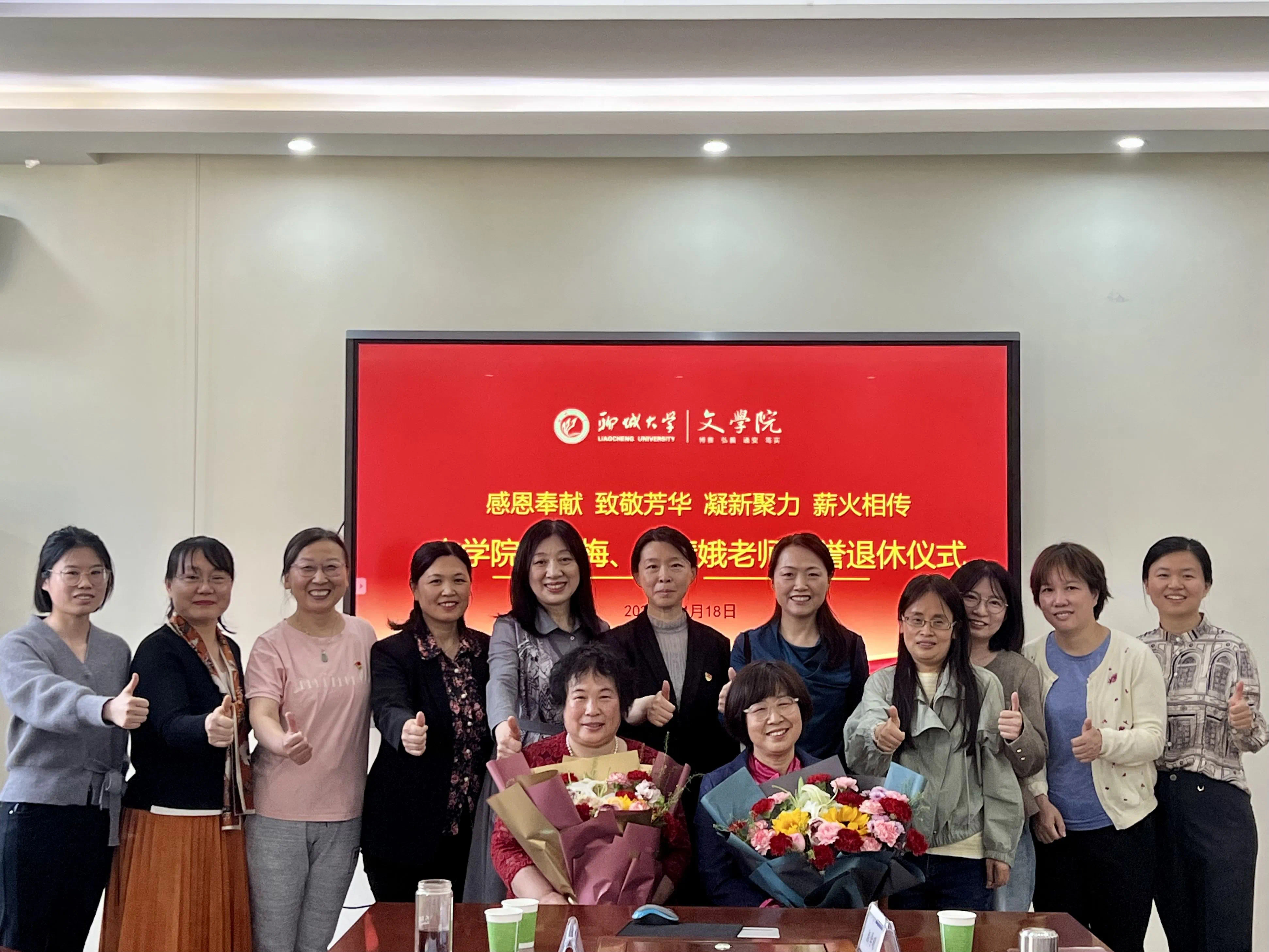 院长卢军代表向日葵视频 全体师生向两位荣休教师表示衷心感谢和诚挚敬意。她指出,两位教师是学院发展的见证者和奉献者,更是优良精神的传承者和弘扬者,他们教学深入浅出,指导耐心细致,用心用情培育人才,并代表学校出国从事汉语教学工作,为学院全体教师树立光辉榜样,为播撒中国文化贡献聊大力量。肖佃军代表校工会衷心感谢两位教师在教育事业中的辛勤付出和卓越贡献,对其专业能力和敬业精神给予高度肯定。他为两位荣休教师颁发证书,并用纪念品表达深厚情谊和美好祝愿。随后,两位荣休教师依次发表退休感言。隋清娥回忆教坛生涯,感恩学院深厚栽培,铭记同事关怀照拂,祝愿向日葵视频 全体师生“乐铺花色,快马逐云”。董秀梅回顾教育经历,感慨时光飞逝,展望退休生活,言辞中饱含对教育事业的执着追求和对全体师生的深深眷恋,对向日葵视频 未来发展寄予殷切期望和美好祝愿。年轻教师代表纷纷表示将传承教育精神,倾情教育事业,为更多学生点亮希望之光,不断开创向日葵视频 高质量发展新局面,助力学校教育事业蓬勃发展。李承虎在总结发言中代表向日葵视频 党委和全体师生向两位荣休教师送上真挚祝福,表示将继续发扬优良传统,为培养更多优秀人才而努力奋斗。最后,在《不忘初心》的悠扬旋律中,在场教师合影留念。