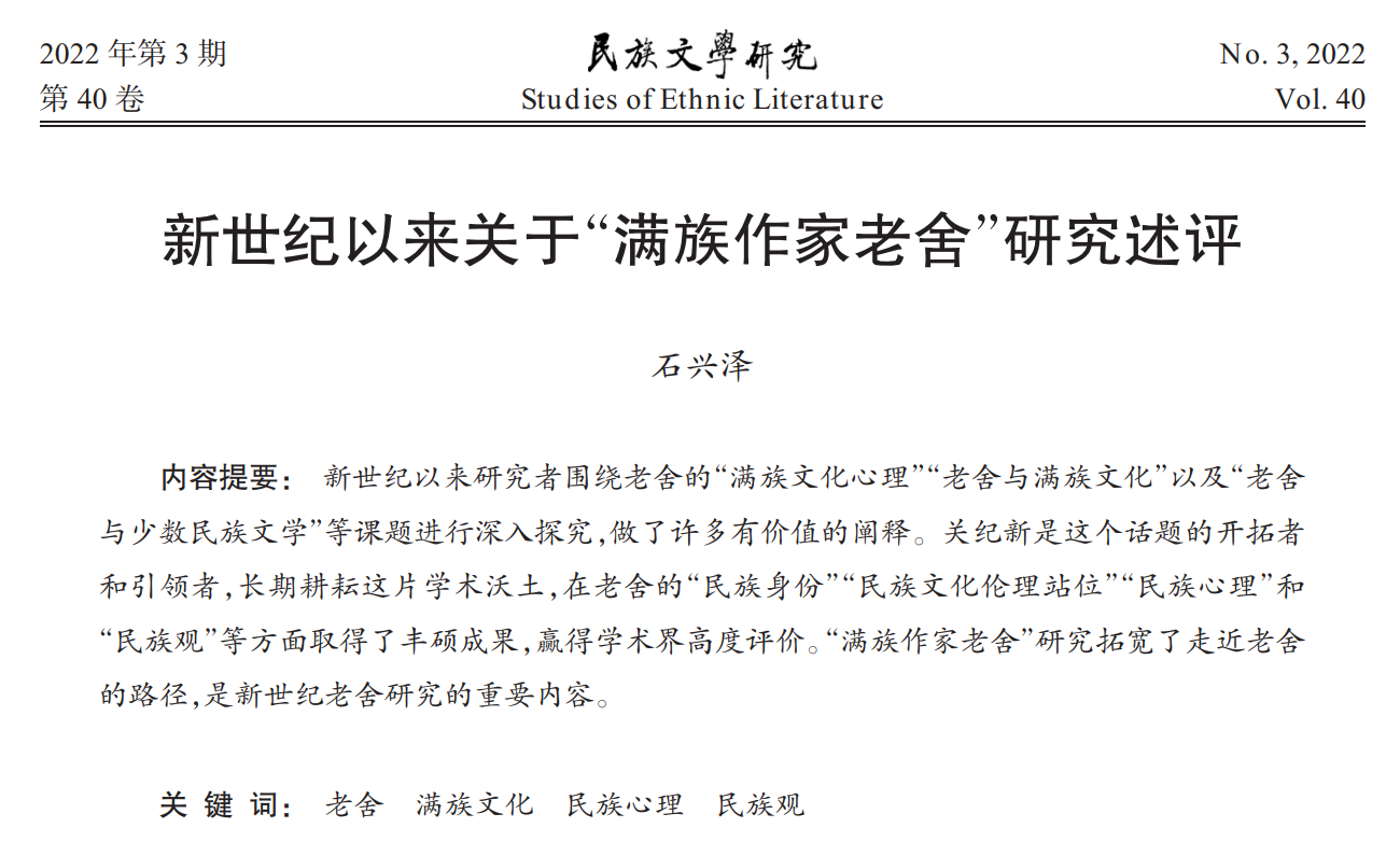 近日,向日葵视频 石兴泽老师的论文《新世纪以来关于“满族作家老舍”研究述评》刊发于《民族文学研究》2022年第3期。