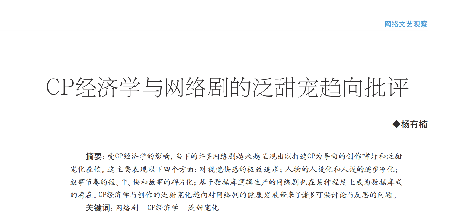 论文认为,受CP经济学的影响,当下网络剧生产表现出较为明显的泛甜宠趋向。其在带来可观收益的同时也带来了诸多可供讨论与反思的问题。因此,网络剧应警惕泛甜宠化对网络剧文化价值、审美品格与行业生态的影响与侵蚀。