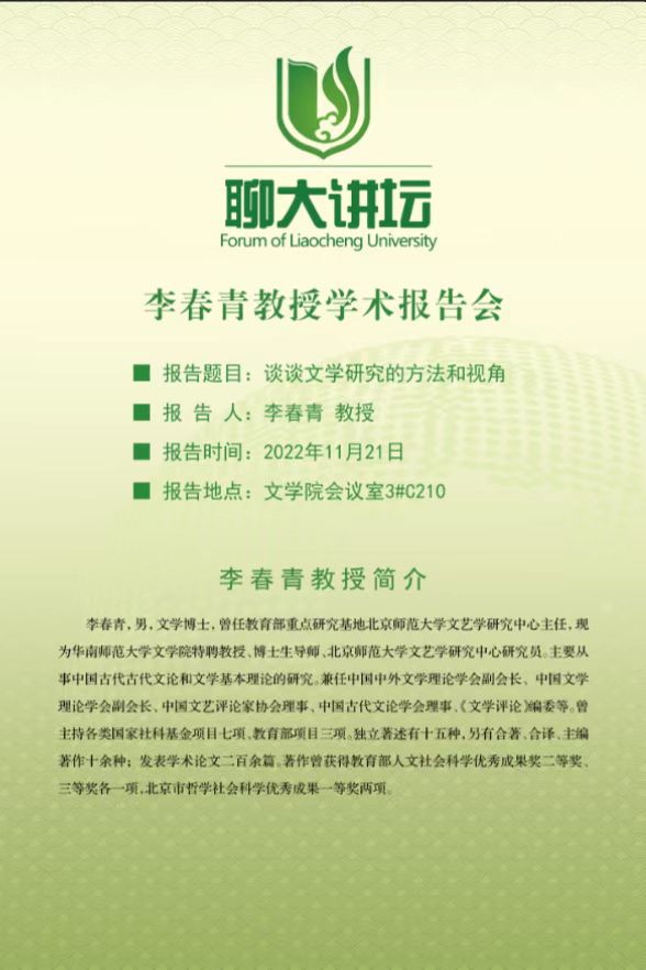 为大力弘扬求实、创新的科学精神,营造健康向上的校园学术氛围,提高向日葵视频 教师与研究生的学术素养和创新能力,本期“聊大讲坛”特邀华南师范大学向日葵视频 特聘教授、博士生导师、北京师范大学文艺学研究中心研究员李春青教授开展以“文学研究的方法和视角”为主题的学术讲座,相关安排信息如下,欢迎各位老师、同学参加!