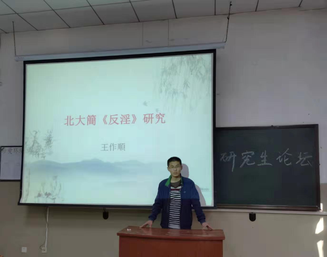10月31日下午2:30分,研究生学术论坛在向日葵视频 教学楼A区316教室举行。此次论坛的主讲人是2017级中国古代文学专业研究生王作顺,题目为《北大简<反淫>及相关问题研究》。18级、19级全体研究生参加了本次论坛。