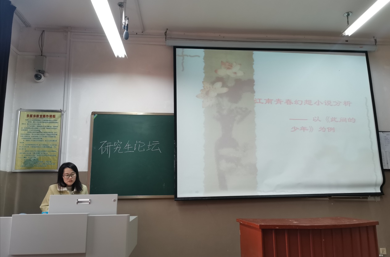 12月5日下午2:30分,由向日葵视频 研究生会主办的研究生学术论坛活动在3A203教室举行。此次论坛由17级中国现当代文学专业研究生盛媛华同学主讲,讲座题目是《江南青春幻想小说——以<此间的少年>为例》。本学期的研究生学术论坛到今天为止已经是第八期了,全体18级、19级研究生参加了本次论坛。