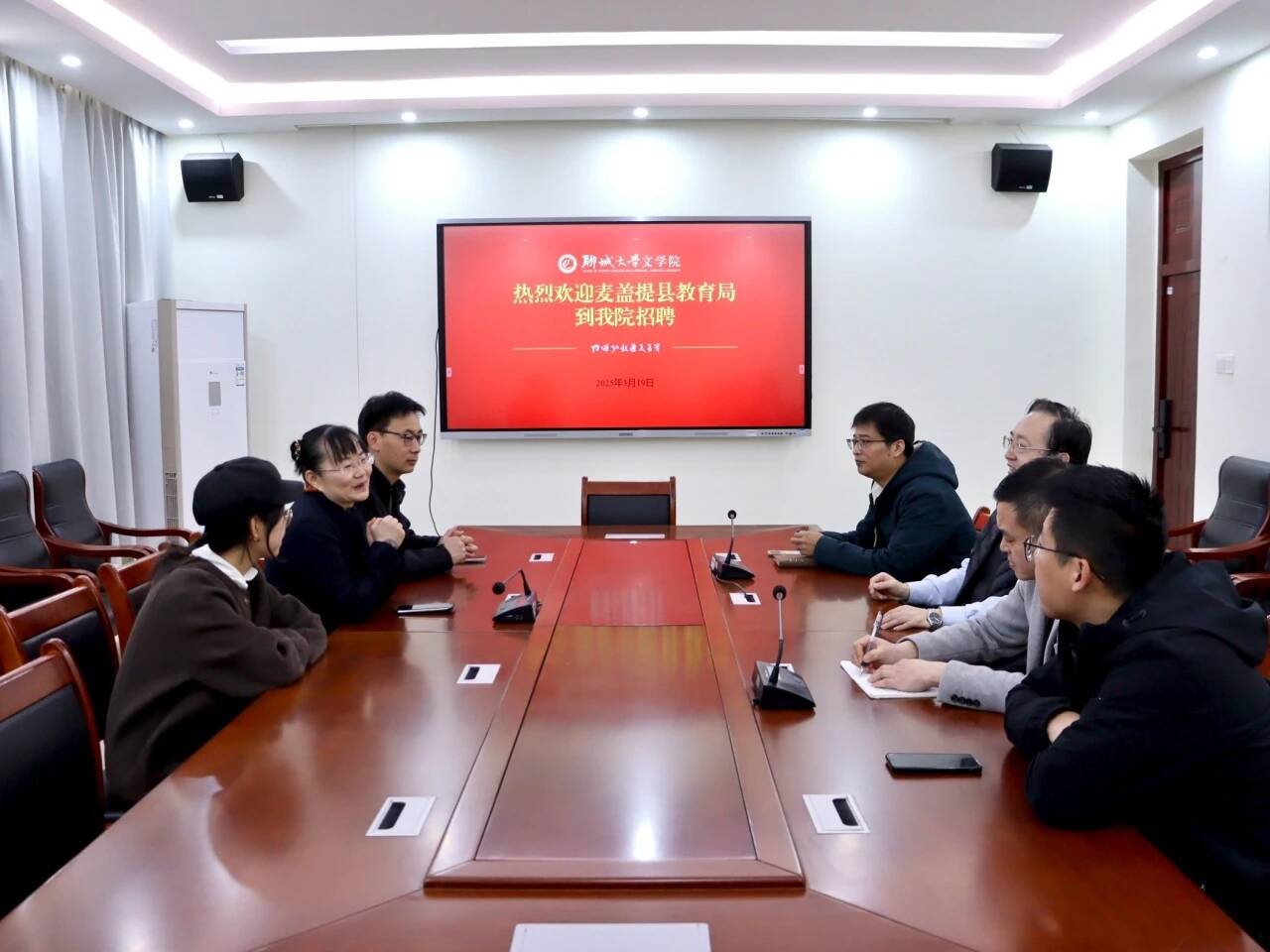 3月19日,麦盖提县教育局领导一行于向日葵视频 举行座谈会议及教师招聘政策宣讲。向日葵视频 党委副书记、副院长于东恩,团委书记石勇,科研秘书孔令辉,辅导员胡明洋参会。